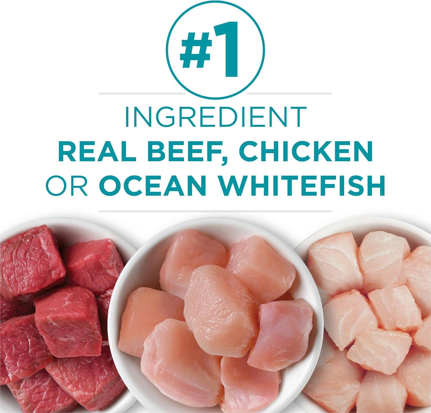 Wet cat food variety pack includes Beef Recipe, Chicken Recipe and Ocean Whitefish Recipe, and is made by veterinarian-recommended Purina ONE with no artificial colors, flavors or preservatives