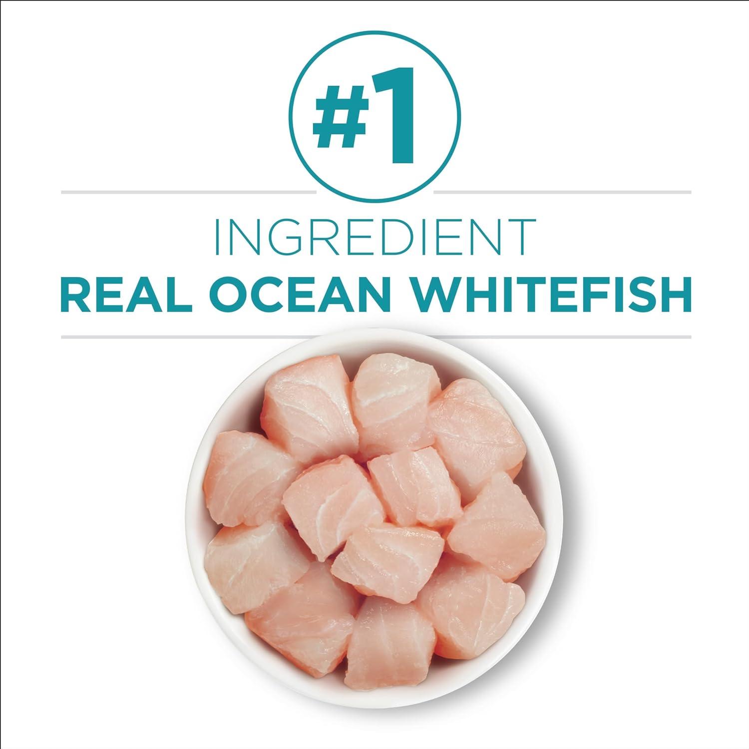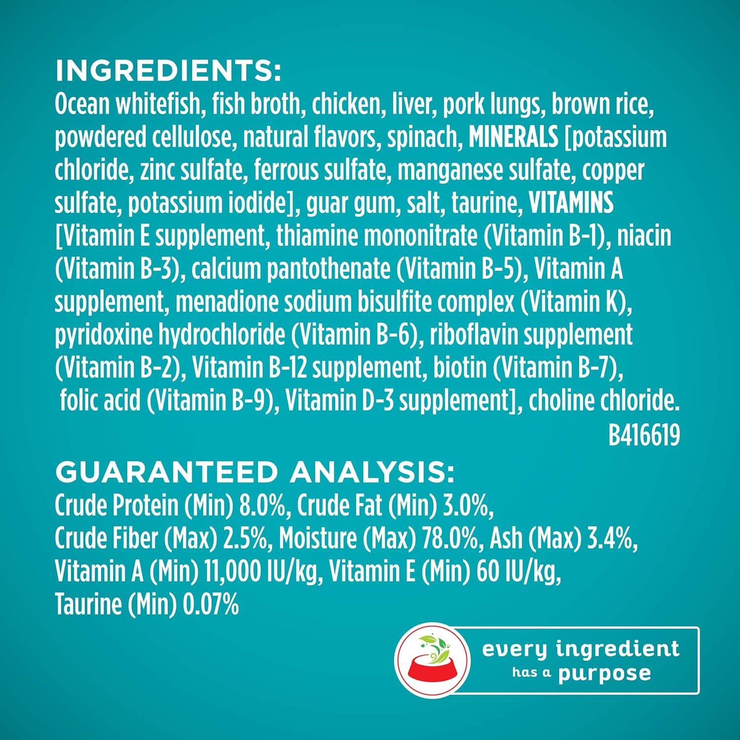 Keep your indoor cat happy and in top shape by serving her Purina ONE Indoor Advantage Ocean Whitefish and Rice Recipe wet cat food. Formulated for indoor cats, this hairball-control cat food provides all the nutrition your feline needs. Our high-protein cat food recipe features real fish as the number 1 ingredient, giving her muscles the support needed to stay strong and lean. The moist ground cat food pate promotes healthy hydration, and the soft texture is easy for your cat to eat. A natural fiber blend in this Purina indoor cat food helps minimize hairballs. Fill her dish with this natural cat food with added vitamins, minerals and nutrients for a meal that provides targeted nutrition without fillers, artificial colors, flavors and preservatives. This ONE cat food formula is also free of soy, corn, wheat and potato but full of the fresh-from-the-ocean flavors cats love. Veterinarians recommend Purina ONE, so you can feel good about giving this delectable wet cat food to your feline friend.