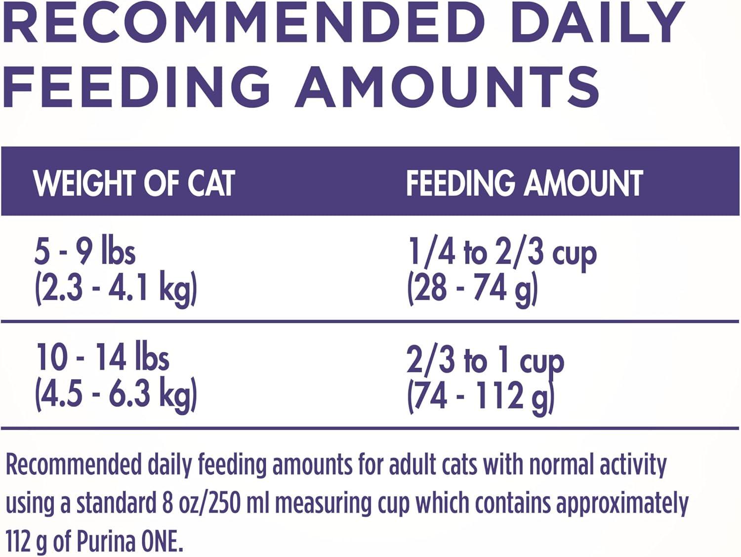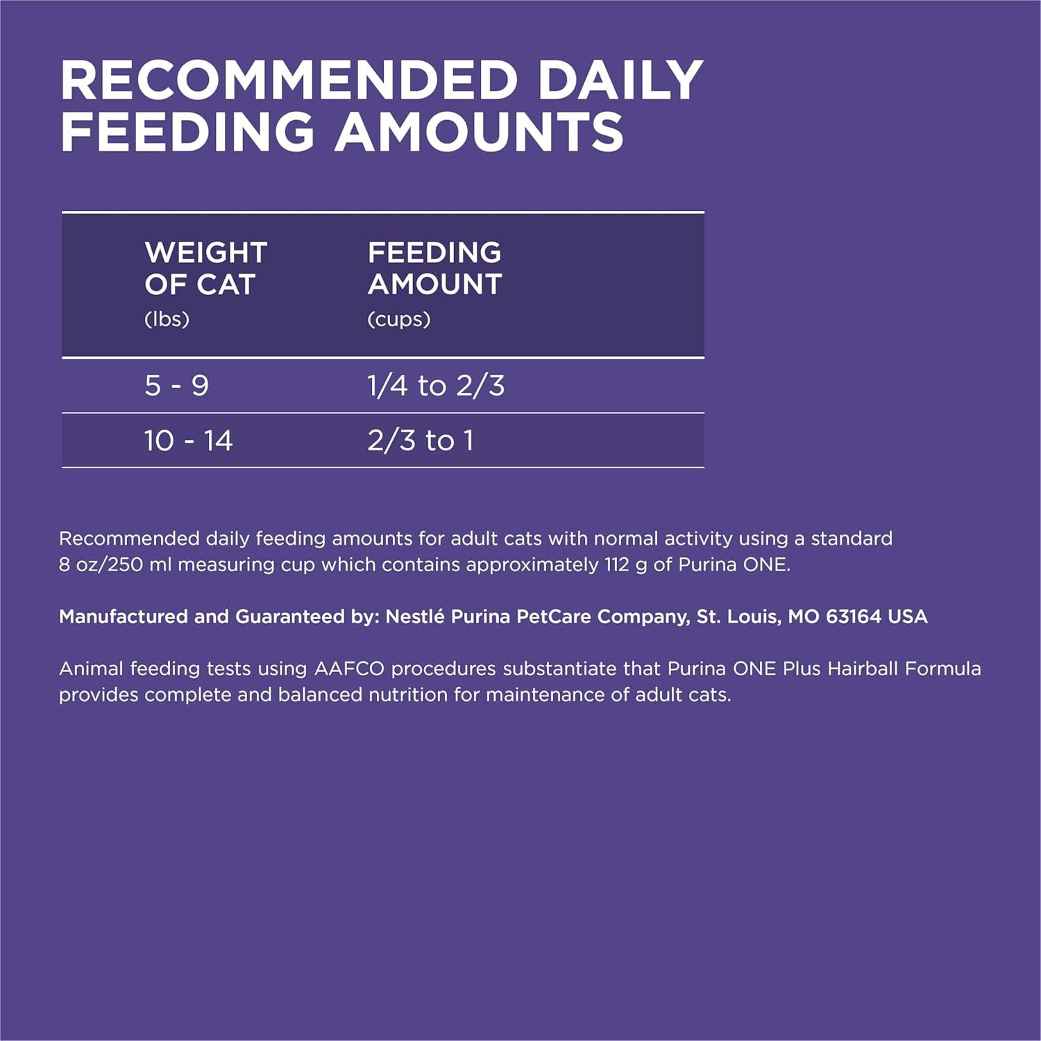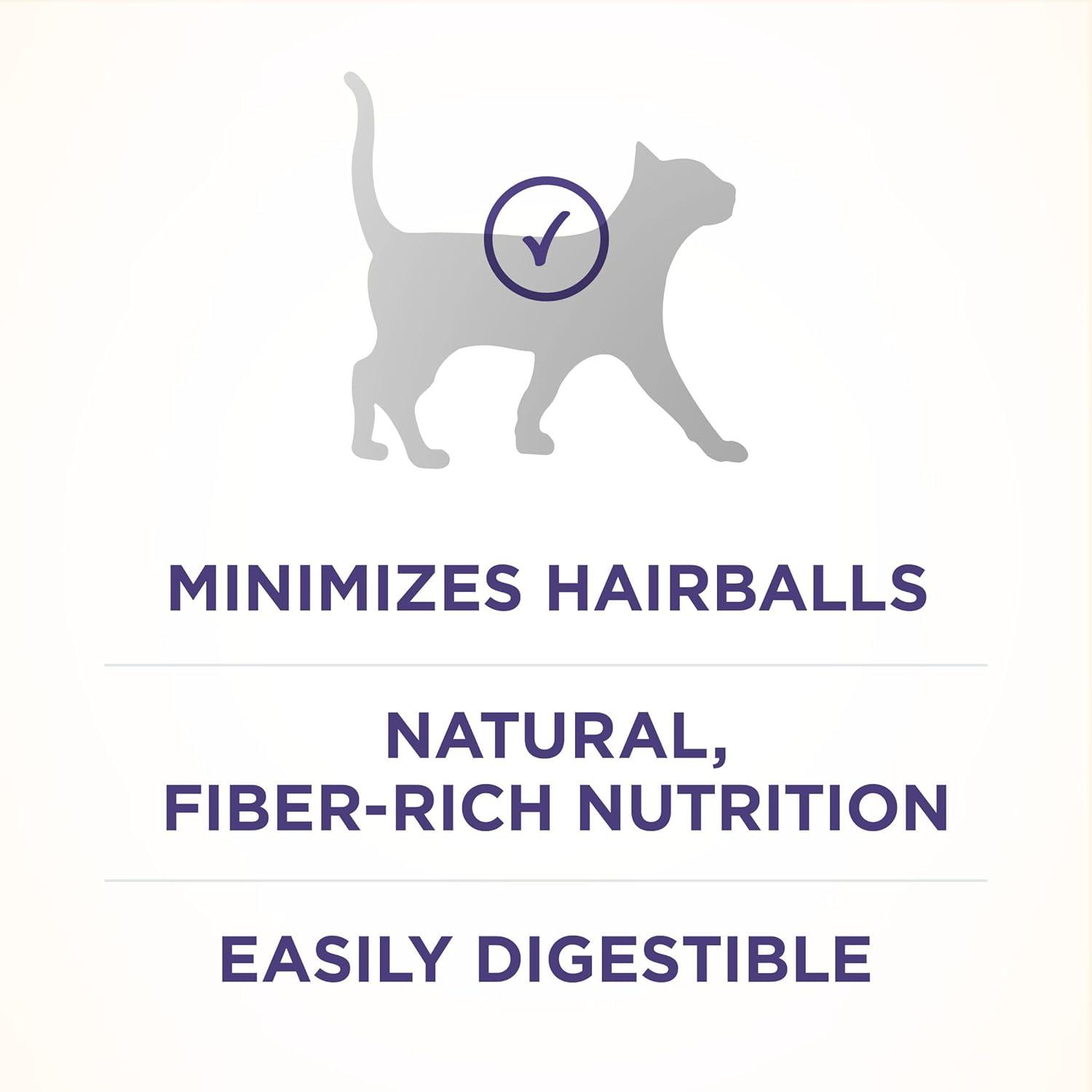 Use the combined power of nature and research to get results you can see with Purina ONE +PLUS Hairball Formula adult dry cat food. This easily digestible recipe includes a SmartBlend of high-quality ingredients. The hairball control cat food starts with real chicken as the number 1 ingredient and has 38 grams of protein per cup, helping to support her strong muscles. A natural fiber-rich blend helps minimize and control hairballs, and four antioxidant sources in this hairball cat food help support her strong immune system. This natural cat food recipe with added vitamins, minerals and nutrients delivers 100 percent complete and balanced nutrition for your adult cat. With 100 percent nutrition and 0 percent fillers, every ingredient has a purpose. Our high fiber cat food is crafted as part of a veterinarian-recommended brand to give you the confidence of knowing that you are offering a premium cat food.