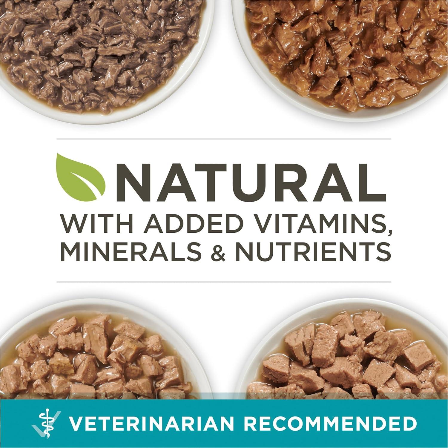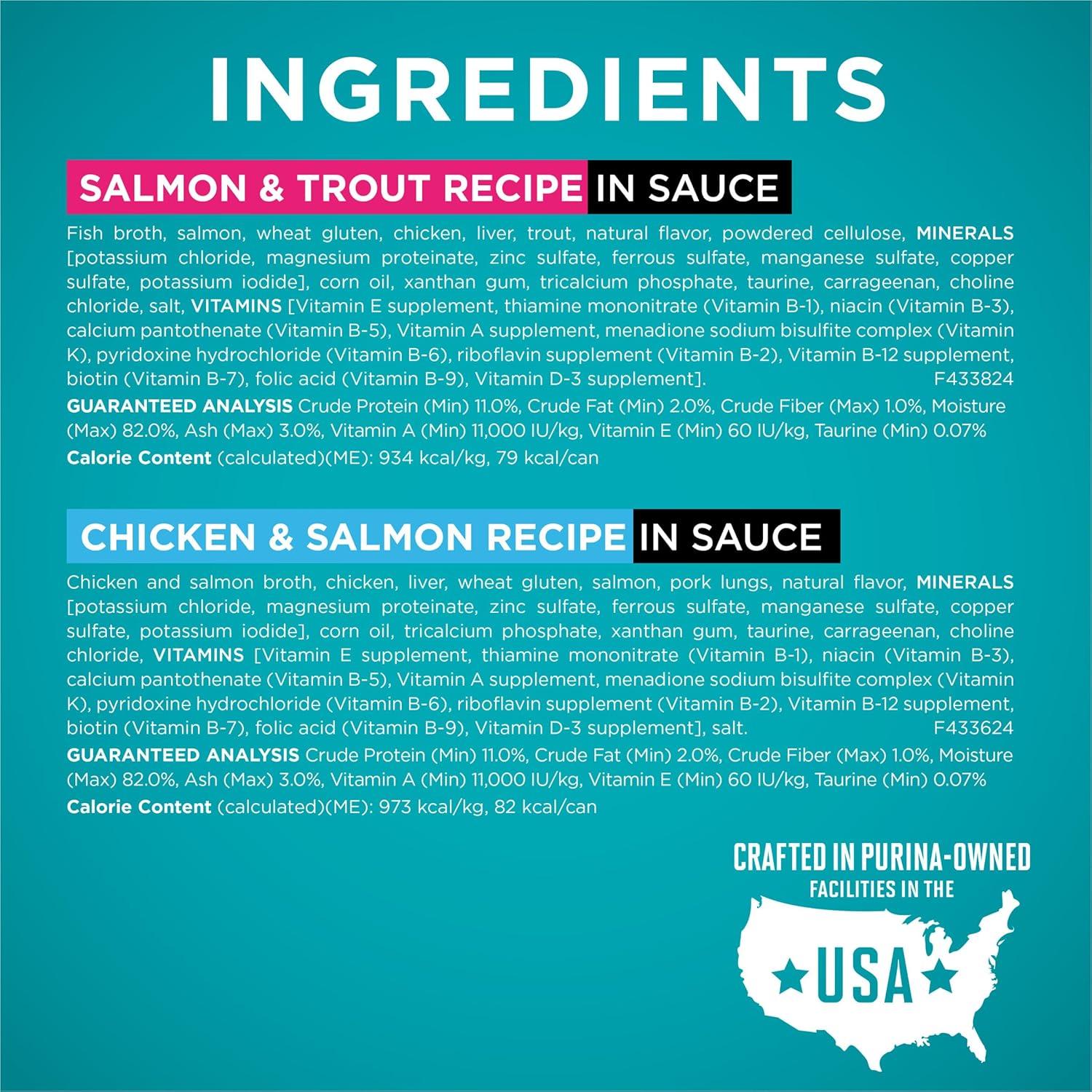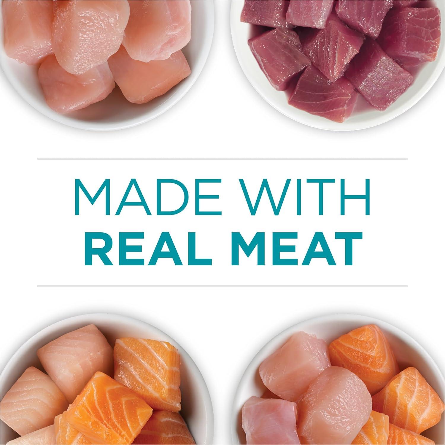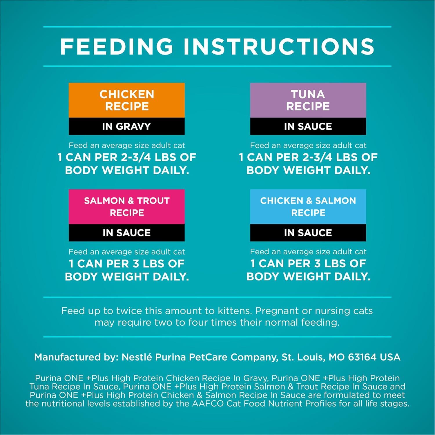 Dish up four delicious recipes for your cat with a Purina ONE True Instinct Natural High Protein wet cat food variety pack with added vitamins, minerals and nutrients. Each canned cat food recipe is made with real chicken or fish and other high-quality ingredients. Let your cat delight in the tastes of tuna, chicken, salmon or trout as she selects her favorite recipes from this soft cat food variety pack. She gets the taste she loves along with the nutrition she needs. Plus, these high protein wet cat food formulas help support her strong muscles, and the moisture-rich cat wet food formulas support healthy hydration. Each serving provides 100 percent nutrition for cats of all life stages and 0 percent fillers, which means every ingredient serves a purpose. Give your feline the variety she craves while providing purposeful nutrition for lifelong whole body health with these Purina ONE high protein cat food recipes.