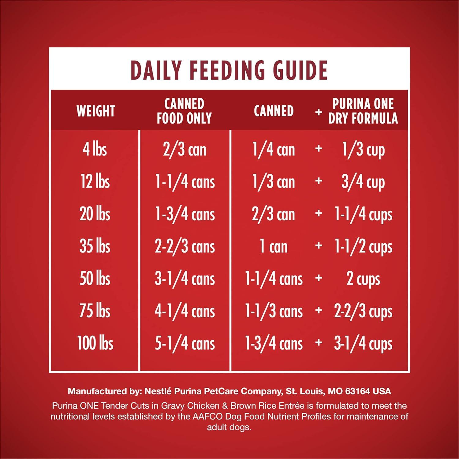 Deliver delicious chicken flavor to your dog's bowl with Purina ONE Natural Tender Cuts Chicken and Brown Rice Entree in Gravy adult wet dog food with added vitamins, minerals and nutrients. Real chicken gives him the poultry he loves, and brown rice balances out the dog food recipe for a great-tasting finish. The rich, savory gravy adds moisture and flavor, giving him a reason to lick his bowl clean, and tender, meaty morsels in this high protein dog food offer a tempting texture. Plus, each serving of this wet food for dogs contains high protein to support his strong muscles. We make this canned dog food formula with 0 percent fillers and no poultry by-products, so every high-quality ingredient has a purpose. This adult dog food formula provides 100 percent complete and balanced nutrition to support his whole-body health. Our Purina ONE Natural Tender Cuts lets you feel good about the dog food cans you serve to your canine companion at mealtime each day.