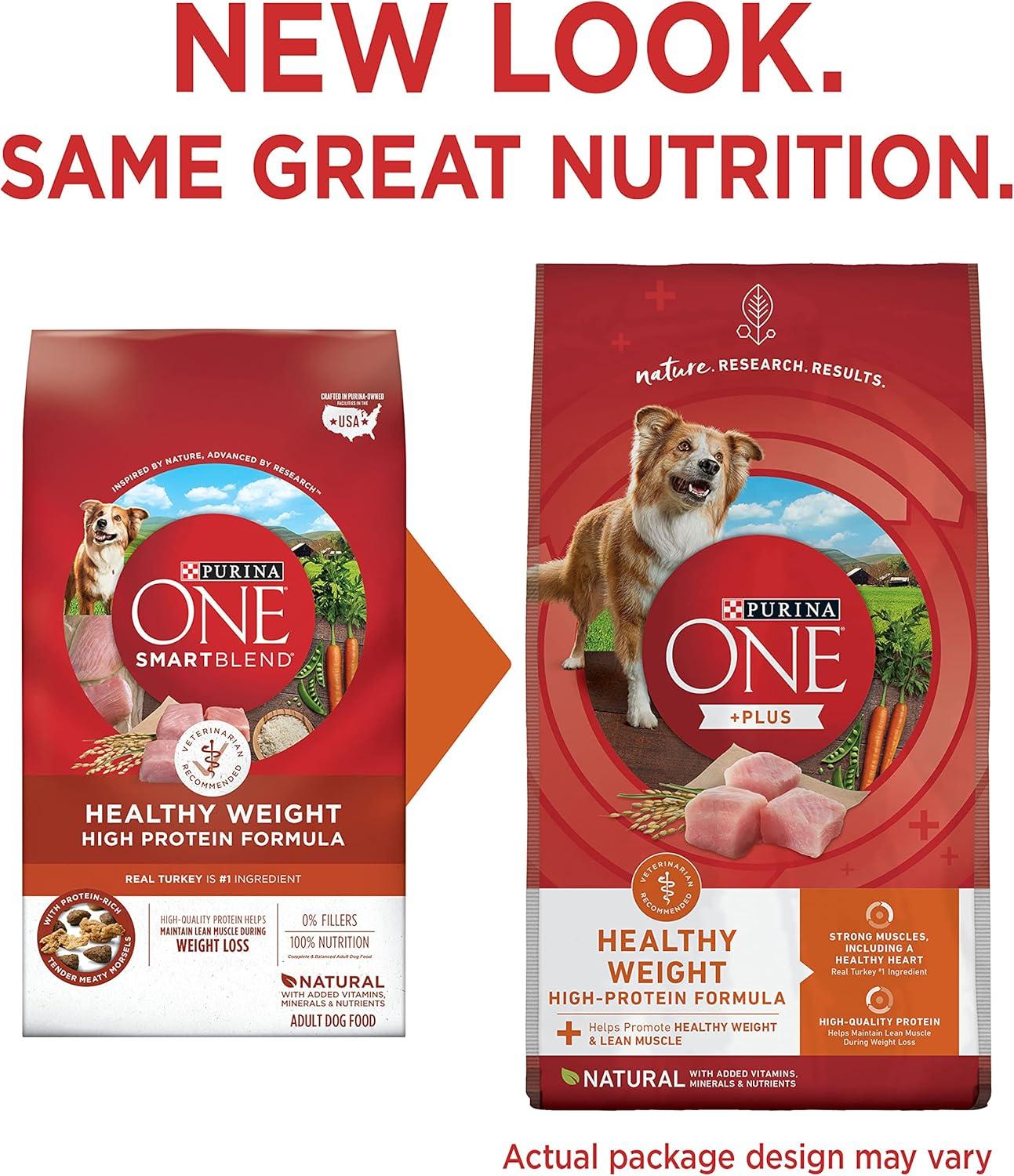 Assist your dog with weight maintenance with Purina ONE +Plus Healthy Weight High Protein Formula adult dog food dry. This healthy weight dog food dry kibble delivers a SmartBlend of high-quality ingredients in a recipe made with real turkey as the number 1 ingredient, helping support strong, lean muscles, including a healthy heart. This high-quality protein in this dog food dry recipe works together with added fiber to promote fullness and an ideal body condition, so your dog gets the nutrition he needs at every meal. Even better, four antioxidant sources in the high protein dog food dry kibble help promote a strong immune system, and natural sources of glucosamine support joint health for dogs. Plus, with a combo of tender, meaty morsels and deliciously crunchy dog food dry kibble, dogs love the taste and texture too. Our Purina ONE weight control dog food dry recipe contains no artificial flavors or preservatives and 0 percent fillers, so every high-quality ingredient has a purpose.