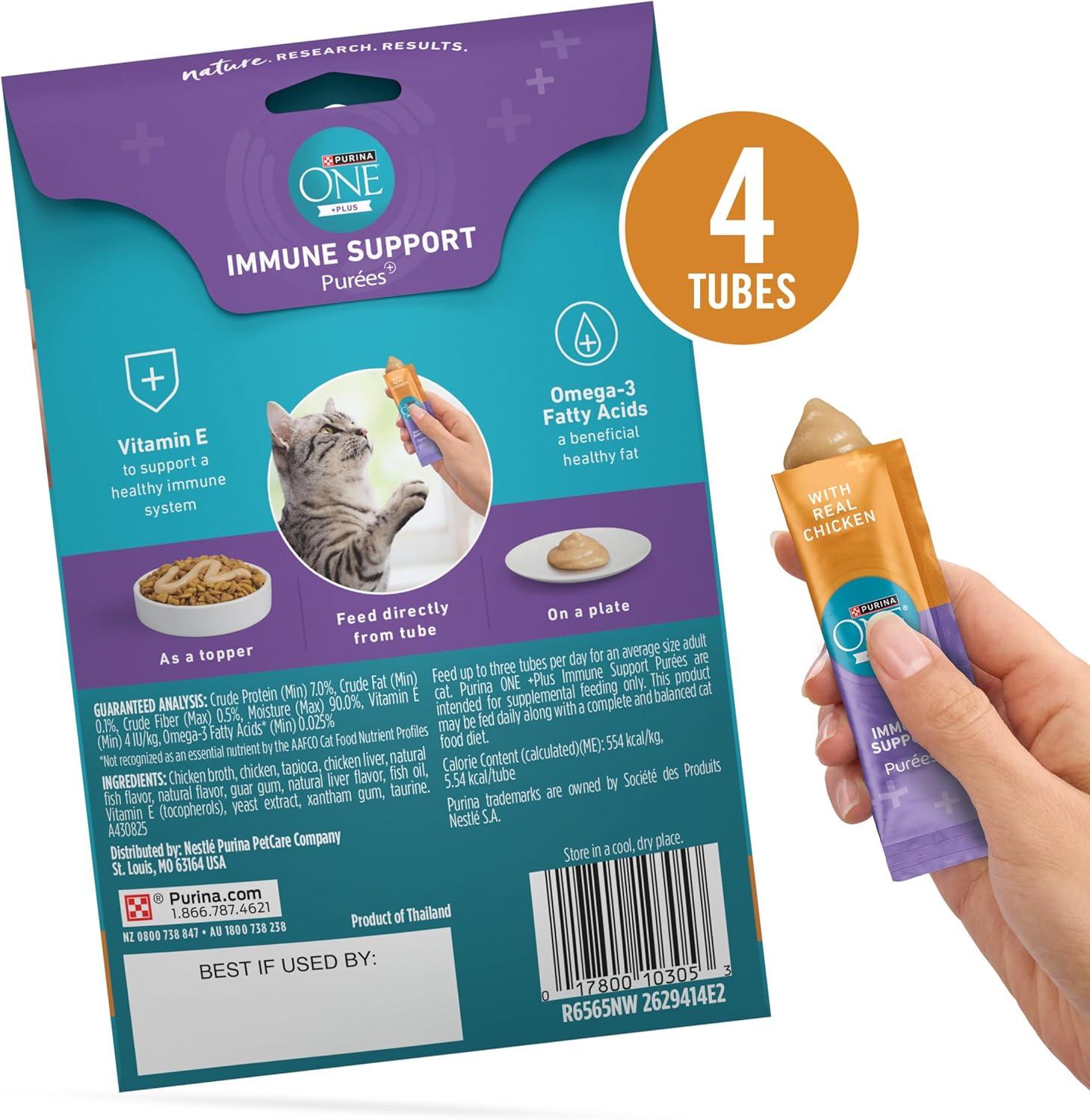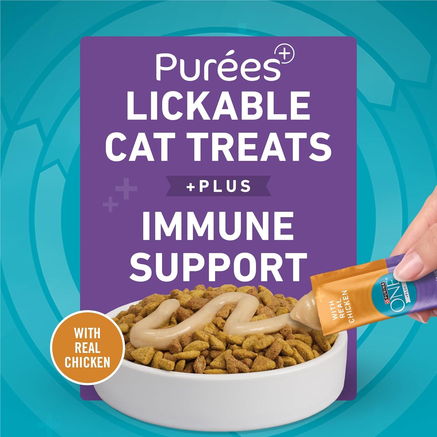 Support your cat’s immune health with a delicious treat they’re sure to love by serving them Purina ONE Plus Immune Support Purees With Real Chicken liquid cat treats. Formulated to support a healthy immune system, these lickable treats feature Vitamin E and Omega-3 fatty acids for a treat that tastes good and is good for them. Each protein-rich puree cat treat is made with real chicken and has a smooth texture that’s easy to enjoy. Delicious and made with chicken, cat treats come in easy-serve tubes sized just right for an effortless way to treat your cat with less mess. The treats can be served directly from the tube for a special bonding moment, squeezed onto a dish for a between-meal snack or added to Purina ONE dry cat food as a nutritious topper. Purina ONE Plus Immune Support Purees provide a healthy nutritious and delicious snack made without fillers for a treat you can feel good about serving your cat.