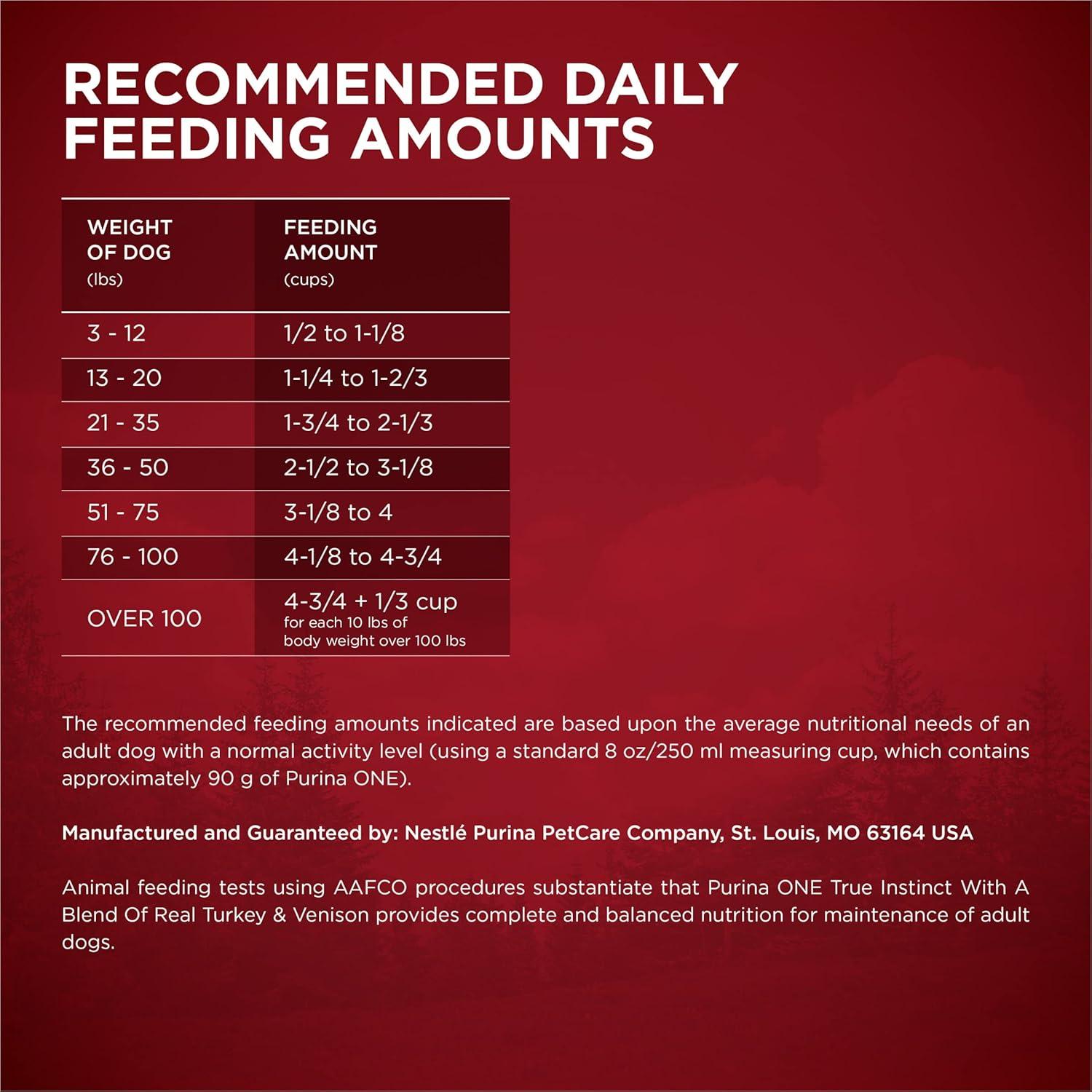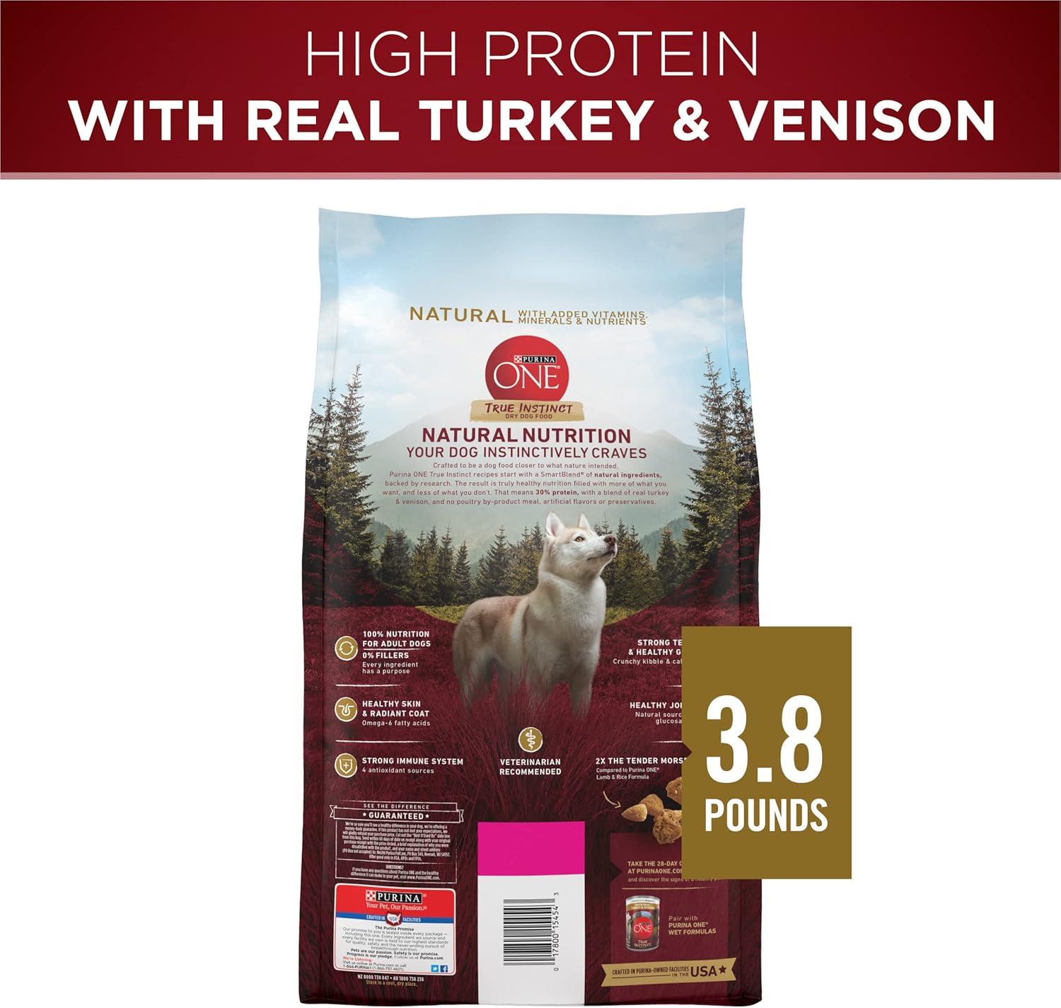 Serve your dog Purina ONE True Instinct With a Blend Of Real Turkey and Venison adult natural dry dog food with added vitamins, minerals and nutrients. With 100 percent nutrition and 0 percent fillers, every ingredient in this wholesome dog food has a purpose. We start our Purina dog food recipe with real turkey as the number 1 ingredient and include real venison. They help to deliver 30 percent protein, which helps support your active dog's strong muscles. We also craft our high-protein dog food with added vitamins, minerals and nutrients and with no poultry by-product meal or artificial flavors or preservatives. This nutrient-dense recipe also features natural sources of glucosamine. A crunchy kibble texture and added calcium helps support his strong teeth and healthy gums. Our complete and balanced adult dog food features two times the meaty morsels compared to our Purina ONE Lamb and Rice formula. Purina ONE True Instinct With Real Turkey and Venison dog food lets you feed your dog the way nature intended.