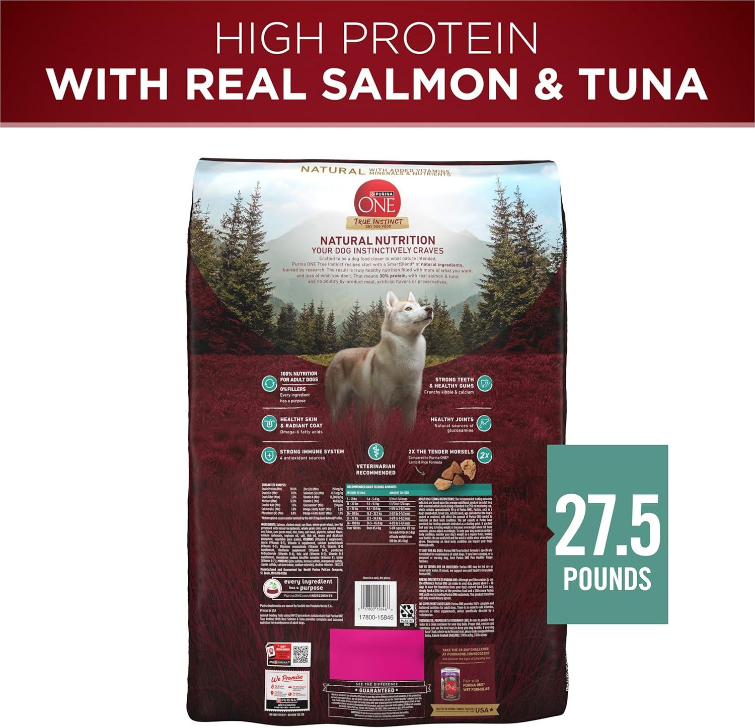 Satisfy your dog's cravings with Purina ONE True Instinct With Real Salmon and Tuna natural dry dog food with added vitamins, minerals and nutrients. Real salmon is the number 1 ingredient, and we include real tuna in every serving. With 100 percent nutrition and 0 percent fillers, every ingredient has a purpose. Every serving also contains 30 percent protein to support his strong muscles along with natural sources of glucosamine to support his healthy joints. Together, they help craft a complete and balanced dog food. Omega-6 fatty acids in the high protein dry dog food also support his healthy skin and a radiant coat, and the crunchy dog food kibble and calcium support his strong teeth and healthy gums. We craft the wholesome dog food with no poultry by-product meal and no artificial flavors or preservatives. Offer up a serving of this Purina ONE True Instinct Natural dry dog food with salmon formula, and show your dog just how much you care.